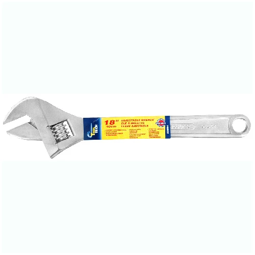 18-in Adjustable wrench. Made of droped forged chrome-vanadium steel. Precision machined thumbwheel. Approximative opening of 2 1/4 in.