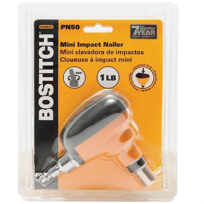 The Stanley Bostitch(r) mini impact nailer is lightweight and offers a comfortable rubber grip designed to insulate and reduce vibrations. Uses for joist hangers, metal connectors and driving nails into confined areas. Features a 360° Swivel air fitting for maximum accessibility. Front exhaust directs air away from user’s palm. Drives most common bulk finish, framing and timber nails.