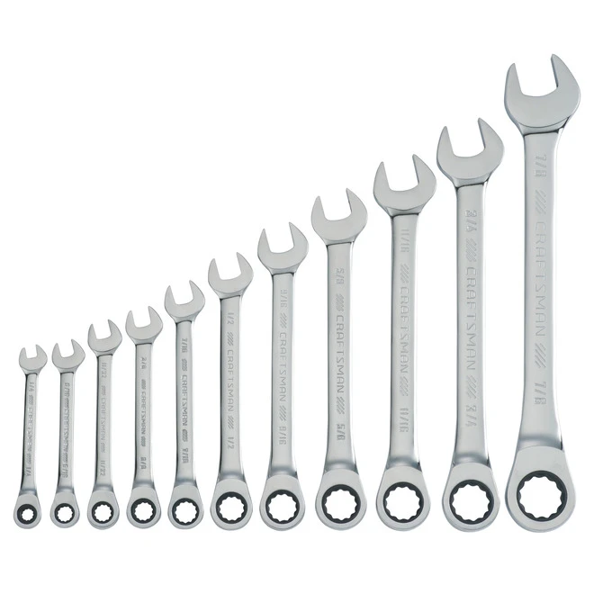 - Includes (11) Ratcheting Wrenches SAE (1/4-in, 5/16-in, 3/8-in, 7/16-in, 1/2-in, 9/16-in, 5/8-in, 11/16-in, 3/4-in, 7/8-in, 15/16-in)