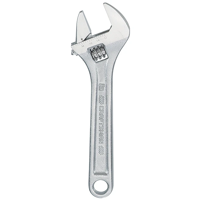 The 6-inch (15.24 cm) Craftsman® adjustable wrench boasts an all steel construction with a chrome finish fully polished ensuring corrosion resistance. It is equipped with wide opening jaws for added versatility. A metric and SAE scale is engraved for easy gauging of work piece size. The wrench meets or exceeds ASME specifications. This product is backed by a lifetime warranty.