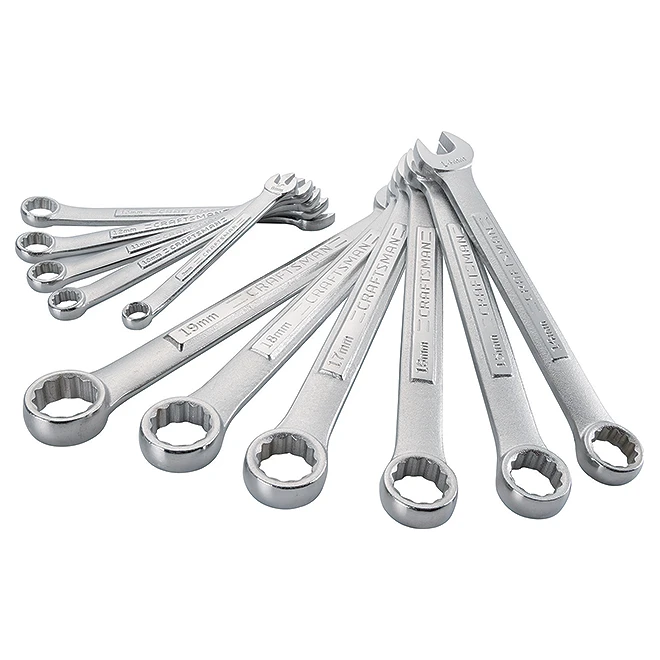 This combination wrench set by Craftsman® features a polished full chrome finish for corrosion resistance and large markings to help you quickly identify the sizes you are looking for. Also, the 12-point socket design allows for quick engagement with fasteners, ideal for lightweight jobs, while the 15° box end offset offers additional knuckle clearance. These meet or exceed ASME specifications. Set includes 11 combination wrenches: 8 mm, 10 mm, 11 mm, 12 mm, 13 mm, 14 mm, 15 mm, 16 mm, 17 mm, 18 mm, and 19 mm. This product is backed by the Craftsman® full lifetime warranty.
