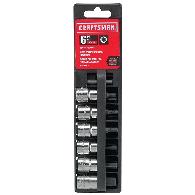 - Includes (6) 3/8-in Dr hex bit sockets SAE (5/32-in, 3/16-in, 7/32-in, 1/4-in, 5/16-in, 3/8-in)