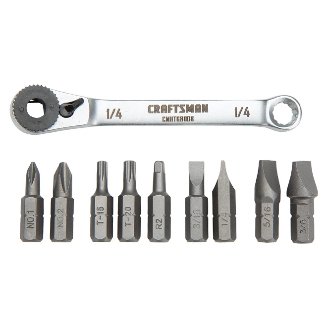 This Craftsman Z-Driver 10-piece set features a 2-position chrome ratchet wrench with an offset-designed handle for use in hard-to-reach areas. The bits are covered with a black oxide finish for superior corrosion resistance. The set includes PH #1, PH #2 Phillips bits, SQ #2 square bit, SL 3/16″, SL 5/16″, SL 1/4″, SL 3/8″ slotted bits and TX15, TX20 star-shaped bits. This set comes with Craftsman’s full lifetime warranty.