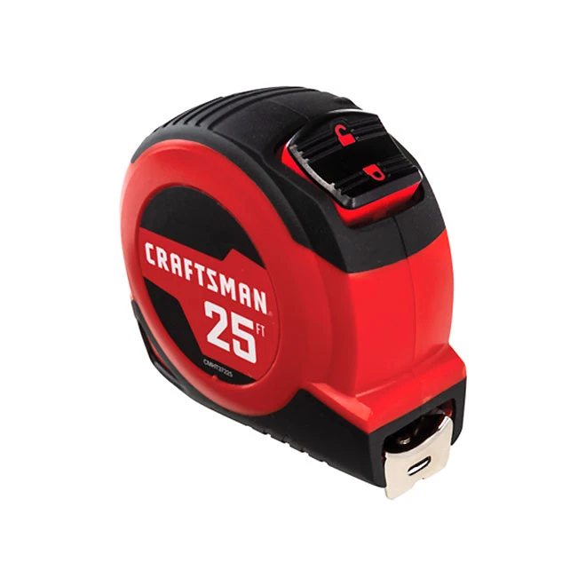 This Craftsman self-locking tape measure stays locked to facilitate taking measures. The lock button allows you to add additional pressure on the tape, and you can unlock it to retract the tape in a controlled manner so that the hook does not slam into the case. The fractions are printed onto the tape, which eases your reading. This tape measure will last you a long time and is backed by a lifetime limited warranty.