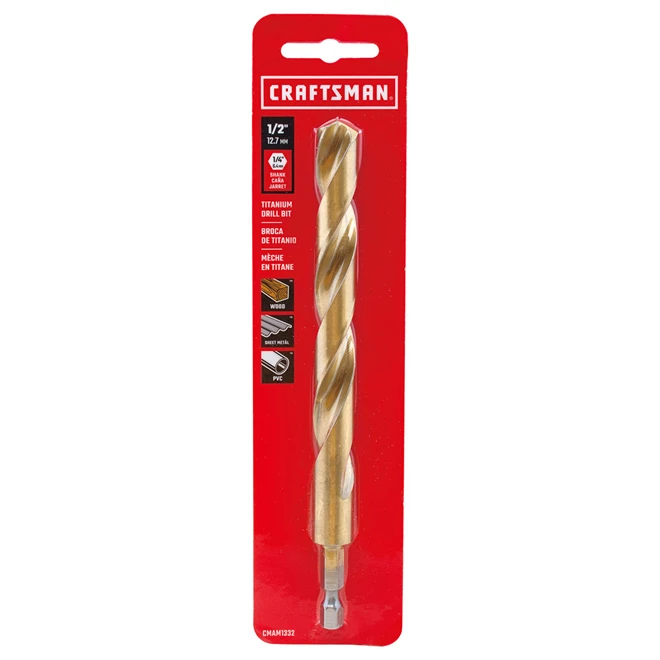 Harness the performance of a Craftsman drill bit for your next project. It powers through metal, plastic and wood to create clean holes. The titanium drill bit features a finish that resists corrosion. This accessory measures 1/2 in D x 6 in L and sells individually.