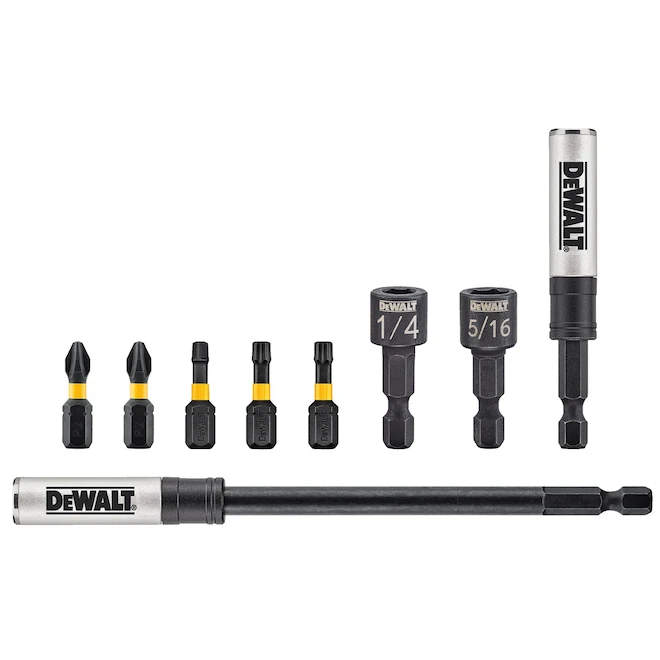 The DEWALT 9-piece impact driver bit kit is easy to use, durable, and precise, making it an essential bit set for all your fastening needs. It features FlexTorq bits that are designed to bend slightly during use to avoid breakage. They also improve torque, which makes fastening simple and quick. This impact driver bit set also has locking bit holders and strong magnetism. Each bit is also CNC-machined to fit perfectly into screw recesses. These features minimize wobbling and slippage during use, giving you a stable and safe experience while fastening screws and nuts for your professional and do-it-yourself projects. This kit also features a quick-change mechanism, making it a breeze to switch bits. Shop this workshop must-have today.