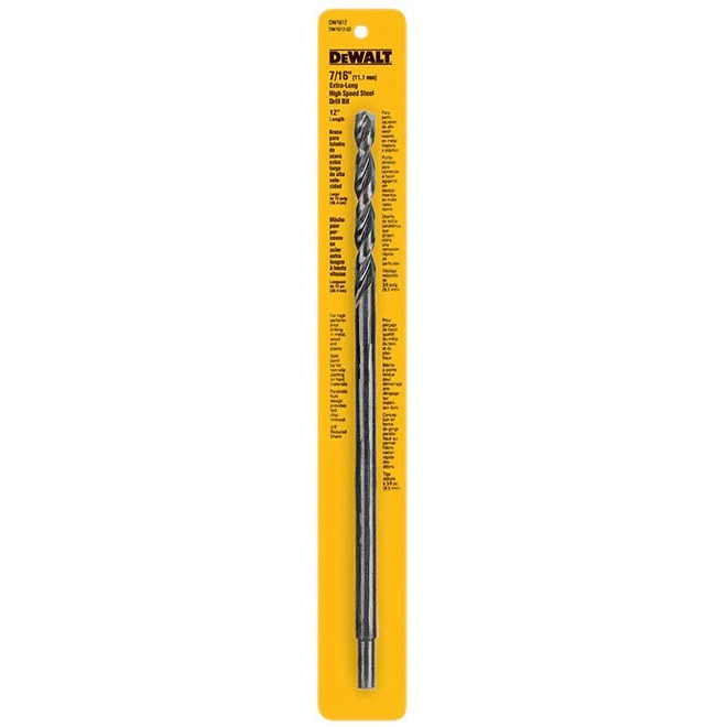 Embark on metal and wood projects with this 12 in L x 7/16 in dia DeWALT drill bit. Its tapered web design prevents bit spinning in the chuck. The 135°, split-point drill bit reduces bit walking. Enhanced with black oxide construction, the bit is resistant to rust and offers good wear. Its parabolic-flute design improves chip ejection.