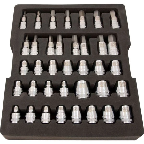 - Set Includes: 6 Pt. SAE Sockets: (3/8-in-1-in); Metric Sockets: (10-20 mm); SAE Hex Sockets: (1/4-in-3/4-in); Metric Hex Sockets: (6-19 mm); foam tray organizer