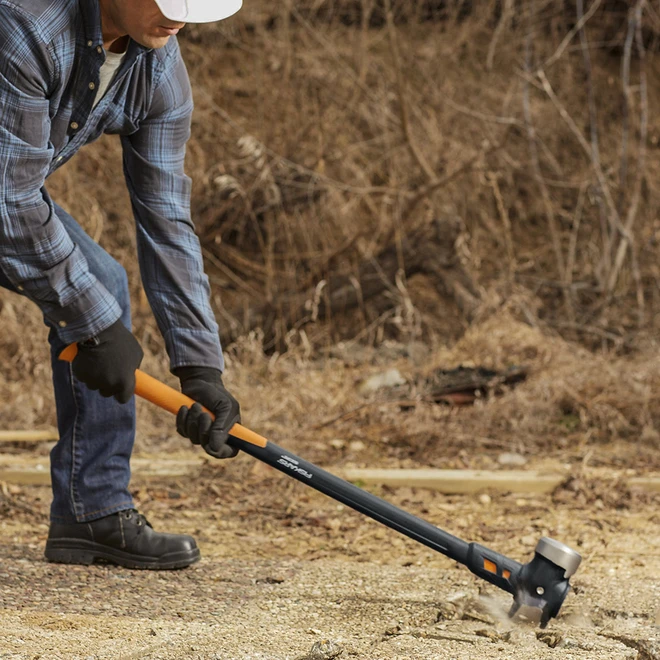 This Fiskars steel sledgehammer has a patented IsoCore(TM) Shock Relief System that has an insulating collar that significantly reduces vibration and absorbs shock. Made from forged, heat-treated steel with a rust-resistant coating, this durable sledgehammer has a wedged demolition head that ensures powerful force and directs debris sideways instead of back. The ergonomically contoured handle provides comfort and control, while the engineered textured grip helps draw away moisture and prevents blisters.