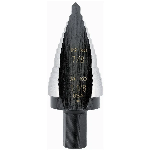 Use the Irwin Unibit step drill bit to drill 7/8 in to 1 1/8 in dia holes. Its 7/16 in L hexagonal shank prevents slipping of the drill chuck. The high speed steel step drill bit has high tensile strength.