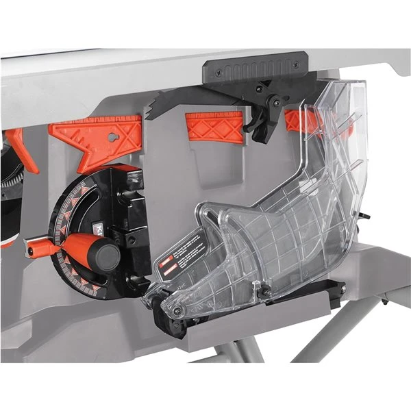 - On-board storage secures rip fence, mitre gauge, blade guard, anti-kickback fingers, extra blades, push stick and blade wrenches during transport