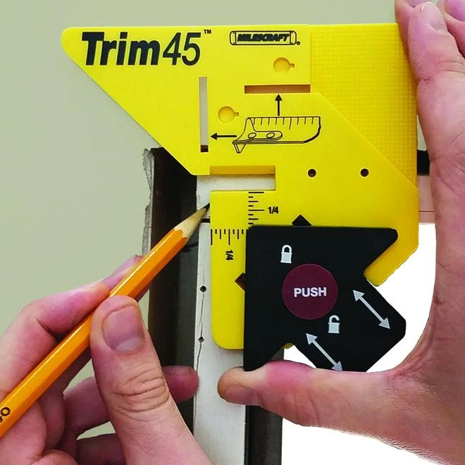 - Unique measuring and marking device eliminates fumbling with a table measure when determining length of finish trim